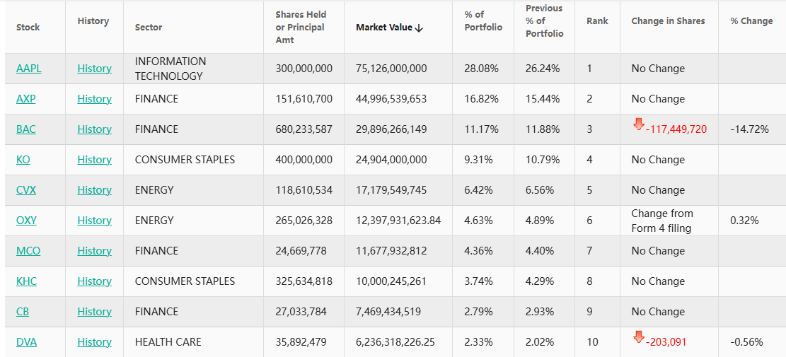 截至2024年四季度末,伯克希尔.哈撒韦公司的前十大持仓分别是苹果、美国运通、美国银行、可口可乐、雪佛龙、西方石油、穆迪、卡夫亨氏、安达保险以及德维特,前十大持仓集中度为89.72%。