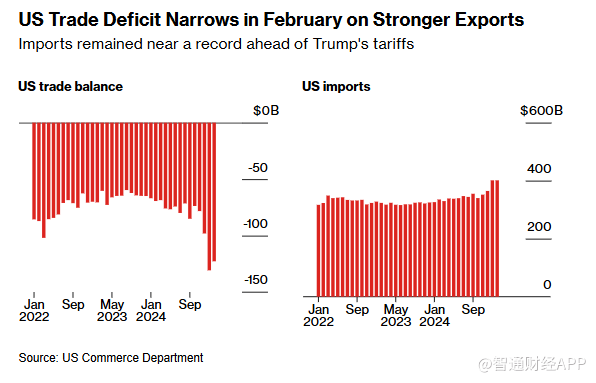 数据显示,经通胀因素调整后,美国商品贸易逆差在年初创下历史新高后,2 月份小幅收窄至1354亿美元。
